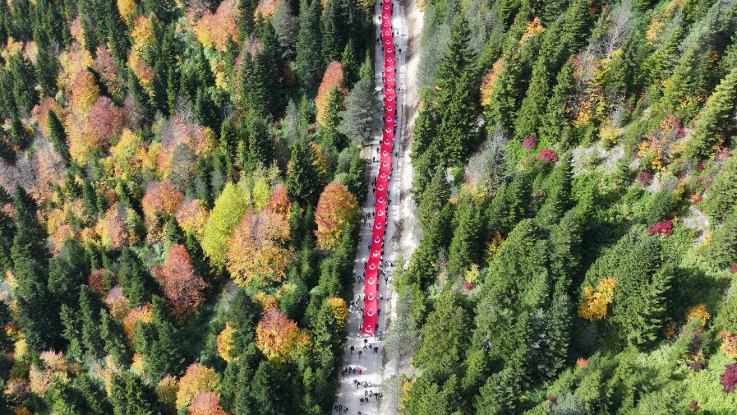 Yürüyüşe katılan doğaseverler, 100 metre uzunluğundaki Türk bayrağını 7,5 kilometre taşıdı.